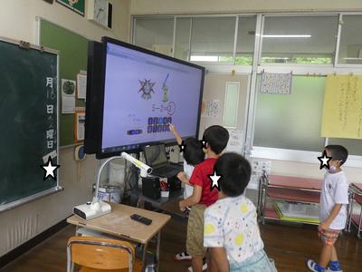 一年生は、計算で悪者をやっつけるゲームをしました。