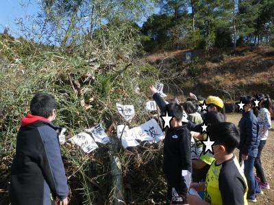 一人一枚書いた習字を燃える場所に入れて、6年生が火入れをしました。