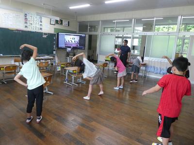 運営体育委員会があしきた体操をロイロノートの動画で撮り、それをお手本にして各学級で観ながら体操をしました。