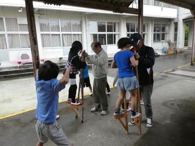 そして、手作りの竹馬を四セット寄贈していただきました。