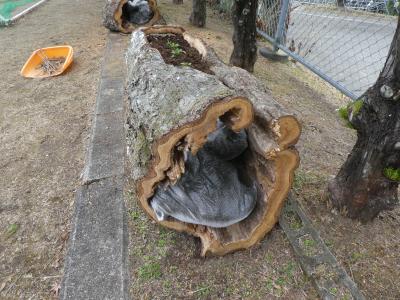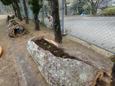忍者の森で枯れた木を伐採し、その木の空洞を利用して花壇を作りました。