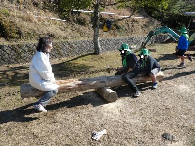 一川さんはグラウンドに丸太のシーソーを作ってくださいました。腐食剤を塗る前ですが、さっそく校長先生と5年生が遊んでいました。