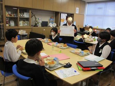 後半は給食を囲んで、各委員会からの取組の発表を行いました。