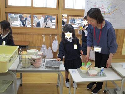 片付けは、手順に沿って、教師がついて教えます。