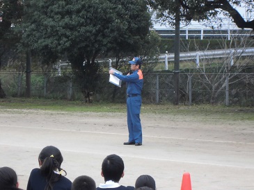 湯沸かし室から火災が発生したという設定で、避難訓練を行いました。消防署の方の話しでは、学校だけでなく、家庭やお店などでも火災が起きる可能性があり、普段から避難方法などを確認しておくことが大切と教えて頂きました。お忙しい中、ありがとうございました。