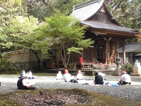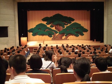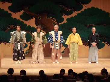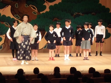 大津町の伝統文化鑑賞体験事業として、狂言鑑賞会に行きました。狂言について説明が行われた後、「盆山」と「簸屑」という狂言が上演されました。言葉は少し難しかったものの、狂言師の方の動きと表情で、子どもたちは狂言のおもしろさを満喫できたようでした。