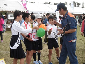 からいもフェスティバルの会場で、10:00~14:00の時間帯に各学校で分担して街頭募金活動を行いました。大津小学校は13:00~14:00の時間帯に街頭募金活動を担当しました。児童会の役員の子どもたちが、大きな声を出して募金を呼びかけました。また、募金をしてくれた小さい子どもたちに風船を渡したり、赤い羽根を渡したりしました。地域の皆さまの善意、ありがとうございました。