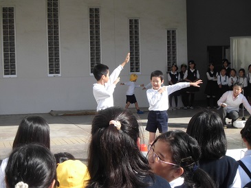 大津町の伝統文化鑑賞体験事業として、狂言鑑賞会に行きました。狂言について説明が行われた後、「盆山」と「簸屑」という狂言が上演されました。言葉は少し難しかったものの、狂言師の方の動きと表情で、子どもたちは狂言のおもしろさを満喫できたようでした。