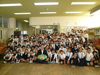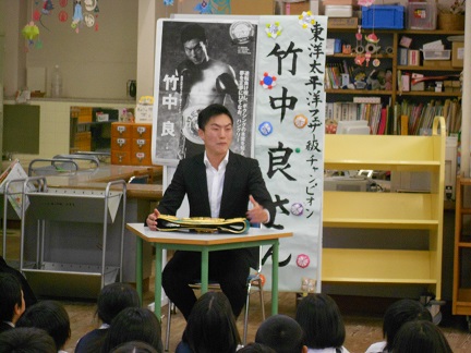 竹中良さん(ボクシング東洋太平洋フェザー級チャンピオン)に来て頂き、チャンピオンベルトを見せて頂いたり、夢に向かってチャレンジする大切さについて話して頂きました。良さんはこの大津小学校の卒業生で、子どもたちの先輩でもあります。お忙しい中、大津小学校に来て頂き、本当にありがとうございました。