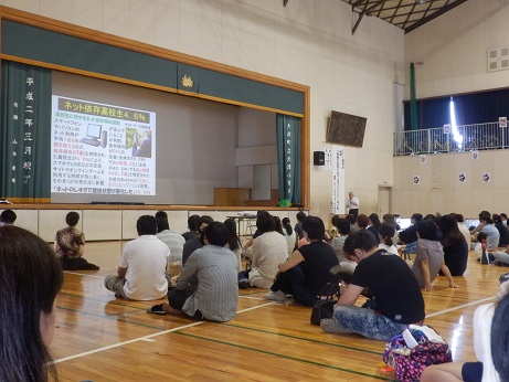 今年度1回目の土曜日授業が行われました。1時間目は授業参観でした。1・2年生は「地震の発生と防災」について学習しました。その後、体育館でPTA講演会が行われました。講師にスクールサポーターの竹下 興治さんをお招きし、演題「情報化社会に生きる子どもたち~光と影~」について講演して頂きました。11:45からは地区ごとに保護者への児童引き渡しを始め、約20分間で引渡訓練は終わりました。保護者の皆様のご協力ありがとうございました。