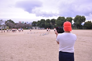 タブレットでハードルを跳ぶ友達を撮影し、フォームの確認をしました。