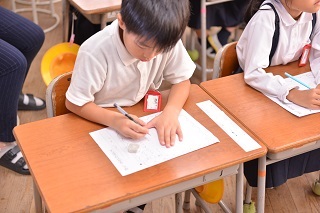 1年生の子どもたちが一生懸命文章を書いています。