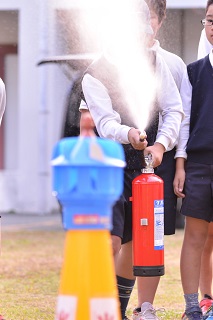水消火器も使いました。代表の子ども防災士と先生で消火器の練習をしました。