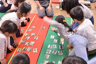 大津町の史跡を題材としたカルタ大会です。すごい勢いでカルタをとっていますね!