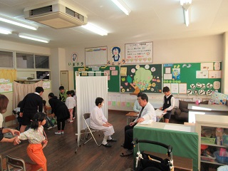 今日は火災避難訓練がありました。消防署の方に避難のやり方についてのお話をしていただいています。