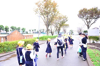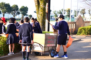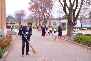 寒い中、朝から子どもたちが落ち葉を掃きます。