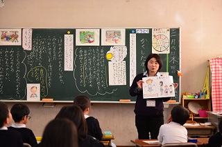声を合わせて詩を読みます。今日は「さよならさんかく またきてしかく」でした。