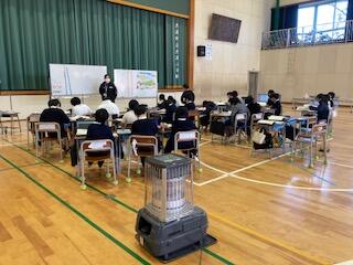 教室に比べると寒い体育館ですが、3年部の先生が運んでくれた4台のストーブに取り囲まれながら、集中して授業に取り組んでいます。