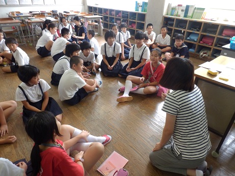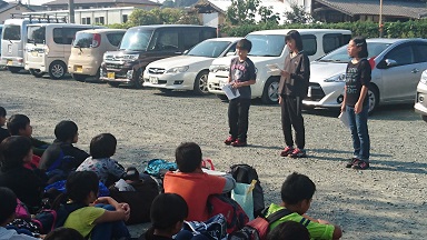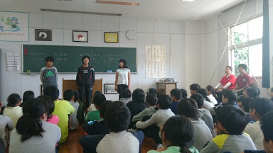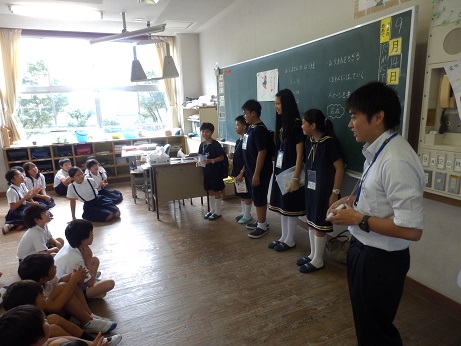 大津中学校の生徒さんたちに来て頂き、中学校の話や、自分が小学生だったときの話、そして、将来の夢の話などをしてもらいました。小学生の子どもたちにとって、とても大きな存在に見えただろうと思います。中学校の話を聞いて、3年後の中学校生活へ期待に胸を膨らませ、目をキラキラさせていた子どもたちです。