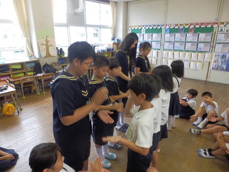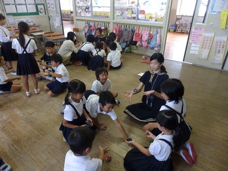 6年生から招待を受けて、1年生は「ハッピー夏フェスタ」に行ってきました。いろんな出し物(キックターゲット,わなげ,ボーリング,めくってハイ&ロー,まとあて,ジェスチャーゲーム,しゃてき,スプーンバラント,くじびき)があり、1年生はとても大喜びで楽しみました。6年生のお兄さんお姉さんが案内や出し物のやり方を優しく説明してくれました。どの出し物にも景品があり、お土産をいっぱい抱えて帰りました。6年生のみなさん、ありがとうございました。