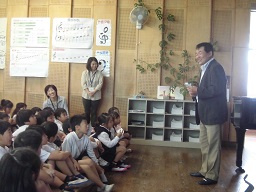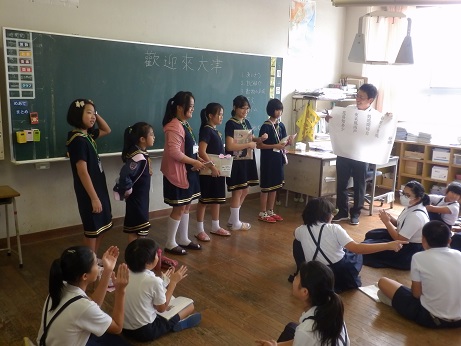 最後に、26年前の大津小学校開校記念文化祭を知る当時の初代PTA会長坂本典光さんをゲストティーチャーとして迎え、当時の話を聞きました。「100年以上歌い続けてきた校歌を子孫と共有したい。孫と同じ校歌を歌いたい。」など、地域の人たちの熱い思いを語って頂きました。子どもたちは、地域の人たちの思いを知り、大津小学校がみんなに大切にされてきたこと、自分たちもふれあい祭を大切にしていきたいなどの思いを持ちました。