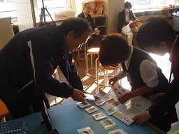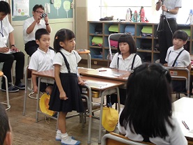 始めに、大津町の昔からの祭りである地蔵祭りの始まりについて、「おじぞうさんがつくられたわけ」という手作りの紙芝居を通して考えました。次に、大津小学校のふれあい祭の始まりについて、「26年前の大津小学校開校記念文化祭の写真」を通して考えました。子どもたちは、自分たちの親が子どものときに大津小学校が室小学校と分かれたこと、校歌と校章は室小学校と同じということ、開校記念文化祭ではいろんなことが行われていたこと、開校記念文化祭がふれあい祭へと名前が変わったことなどを初めて知りました。