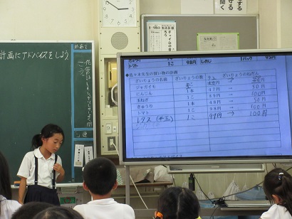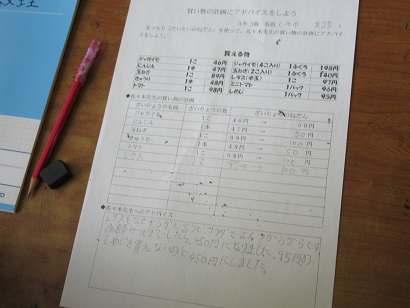 3年2組では、「買い物の計画を立てよう」の学習を行いました。授業では、商品の単価や予算額、購入希望条件などを考慮して、買い物の計画を見直しました。3年生は見学旅行で子飼商店街で買い物をします。今日の授業で学んだことを見学旅行で活かすために、予算内でどのようなものを買うか考え、商品購入の理由や計算方法を明確にして自分の購入計画を立てていきます。