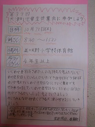 児童会が中心となって、大津町児童生徒集会への取り組みを行いました。10月3日(月)に代表委員会を開き、各委員会の役割を決めました。学習掲示委員会は児童生徒集会の掲示物を作成、その他の委員会は5日(水)~13日(木)にかけて給食時間に各教室をまわり、児童生徒集会への参加の呼びかけを行いました。また、学級ごとに大津町の課題を自分たちのこととして重ねて考え、自分たちにできることを話し合いました。