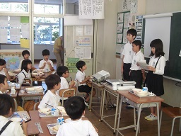 給食センターの栄養士の先生に、食育について講話をして頂きました。給食時間という短い時間の中で、「赤・黄・緑の食べ物」について、今日の給食の食材を実際に準備して、お話し頂きました。1年生の子どもたちは、給食を食べながら、質問に答えたり、疑問に思ったことをたずねたりしながら、話を聞いていました。