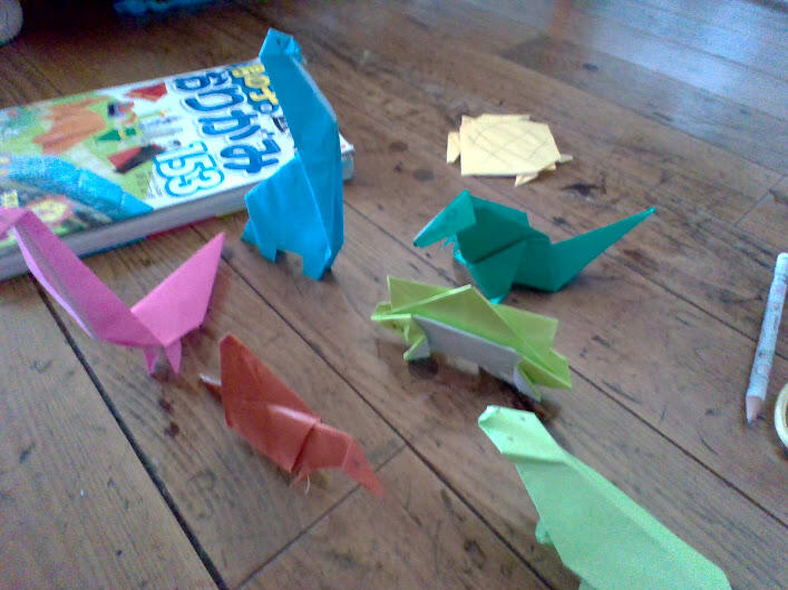 今日は7匹ほど折り紙で恐竜を折りました。