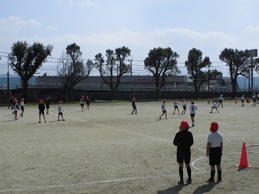 体育で学習したサッカーのまとめとして、クラスマッチを行いました。生活数理の時間に子どもたちが考えたサッカーコートの広さで実際にやってみました。ライン引きも子どもたちが一生懸命やりました。サッカーのゲームだけでなく、協力して計算や準備をすることで、5年生の絆を深めることができました。