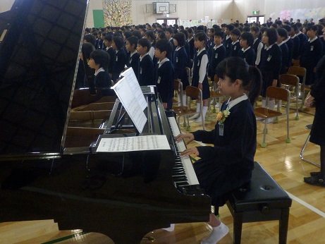 全校児童が集まり、体育館で修了式を行いました。修了証を各学年の代表に渡した後に、1年生と5年生の代表が今年できるようになったことや来年頑張りたいことを発表しました。その後、児童は教室に戻って大掃除を行い、通知表(あゆみ)を受け取りました。1年間本当によく頑張りましたね。