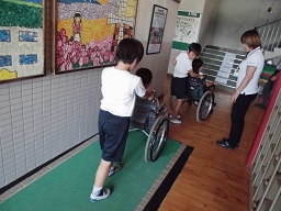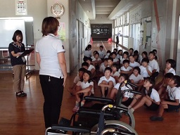 大津町社会福祉協議会の方をお招きし、福祉体験をしました。今年は、車いす体験、アイマスク体験、高齢者模擬体験をしました。これらの体験を通じて、声をかけ合うことや相手の立場に立って考えることの大切さを学びました。会の最後には協議会の方から、「隣にいる友だちや家族、身近な人を大事にしてくださいね。」という温かいメッセージも頂きました。