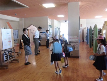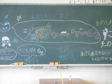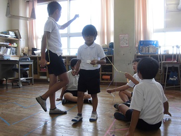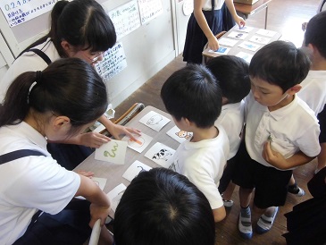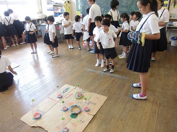 6年生から招待を受けて、1年生は「ハッピー夏フェスタ」に行ってきました。いろんな出し物(キックターゲット,わなげ,ボーリング,めくってハイ&ロー,まとあて,ジェスチャーゲーム,しゃてき,スプーンバラント,くじびき)があり、1年生はとても大喜びで楽しみました。6年生のお兄さんお姉さんが案内や出し物のやり方を優しく説明してくれました。どの出し物にも景品があり、お土産をいっぱい抱えて帰りました。6年生のみなさん、ありがとうございました。