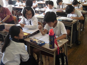 7月25日(月)~7月28日(木)の4日間、大津小学校の図書室やパソコン室などを使って、夏休み学習会が行われました。2年生から6年生までの200名ほどの児童が学習会に参加しました。また、大津中学校の生徒10名、大津高校の生徒13名が学習ボランティアとして、大津小学校の児童のために協力してくれました。優しいお兄さんお姉さんに勉強を教えてもらい、子どもたちは嬉しそうに勉強していました。