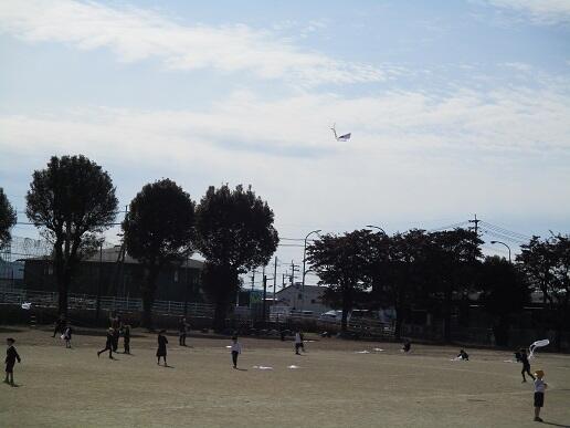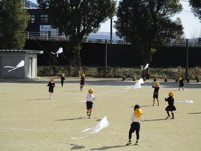 広い運動場は、子どもたちの黄色い帽子と白い凧がばえていました。