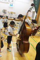子どもたちの身長よりも大きな楽器を持たせてもらったり、弓を引いて音を鳴らしたり、とても貴重な体験ができました。