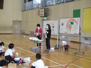 2年生の子どもたちが、絵の具道具の使い方や色の作り方を教わりました。
