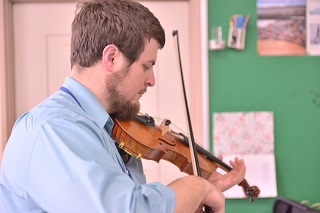 お昼休みにALTのマシュー先生がバイオリンを弾いてくれました。
