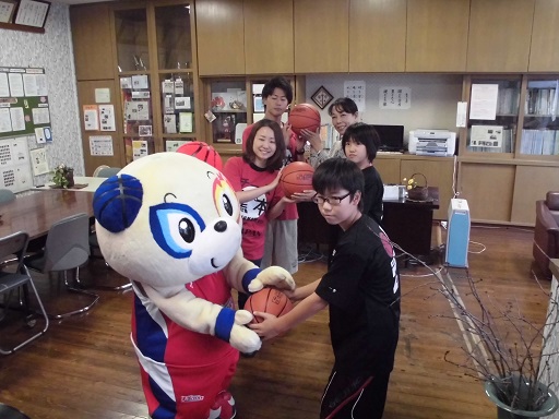 体育館が使用できない大津小学校のバスケットボール部のために、チーム熊本という支援団体から、移動式バスケットゴールとバスケットボールを頂きました。校長室での贈呈式を行った後、放課後に熊本のバスケットボールチーム“ボルタ-ズ”の選手達が、大津小学校の子どもたちに指導してくれました。子どもたちは、プロ選手から指導をして頂きとても喜んでいました。