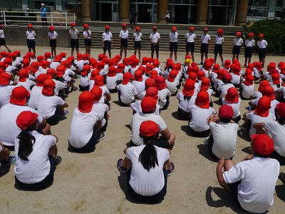 全校児童が集まり、結団式を行いました。今年の運動会のスローガンは、【友情・努力・笑顔 ~今こそ一致団結大津っ子~ ~心を一つにがまだせ熊本~】です。このスローガンのもと、子どもたちは精一杯頑張ります。