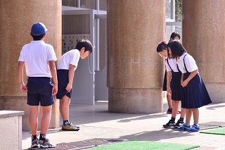 先生に立ち止まって挨拶する様子が見られます。