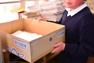 廊下を走らないように、画用紙で三角コーンを作っている様子です。