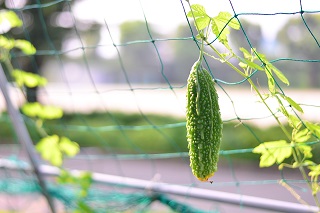 今日の学校の様子です。真夏らしくツルレイシが実りました。