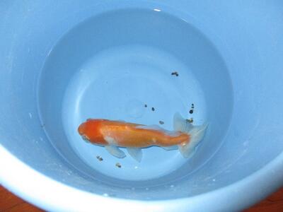 バケツの中で待機している金魚・・・待ち遠しそうです。