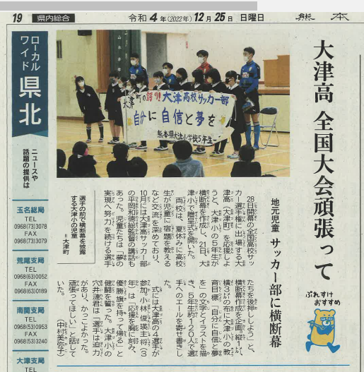 12月21日(水)、本校の5年生が全国高校サッカー選手権大会に熊本県代表として出場する大津高校サッカー部を応援しようと作成した横断幕の贈呈式の様子が、同25日(日)の朝刊で紹介されましたのでお知らせします。