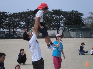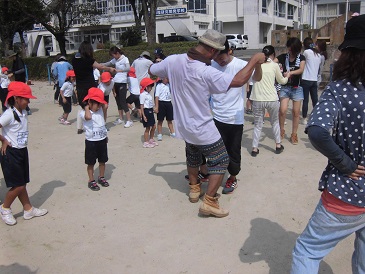 秋空の快晴の中、大津小学校の運動場で、1年生の学年レクレーションが行われました。B-Smileインストラクターの富田さん、荒木さんを講師に迎え、親子でダンスや体操などをしました。親子で少し汗をかく程度のちょうどよい運動をすることができました。その後、各クラスで自己紹介をしました。子ども同士の交流や保護者同士の親睦を図ることができました。