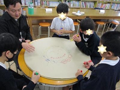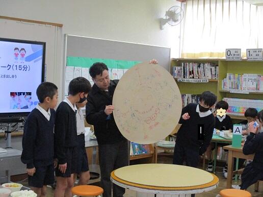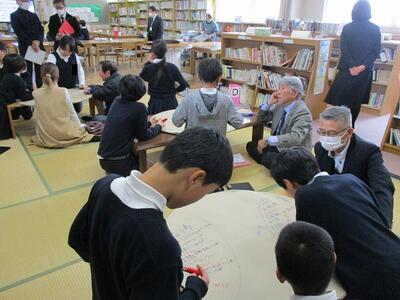 学校運営協議会の委員さん、次年度児童会の新委員長たちの班別協議です。
