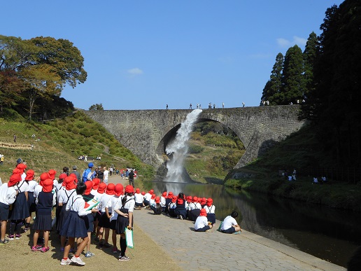 4年生は山都町へ見学旅行に出かけました。通潤橋、通潤橋資料館、円形分水を見学しました。通潤橋の放水やがっしりと造られた石組み、円形分水の水を公平に分ける仕組みなどに感動しました。また、ガイドの方や資料館の方のお話しを伺って、布田保之助さんや種山石工、村人たちの苦労と工夫、そして素晴らしさを感じることができました。