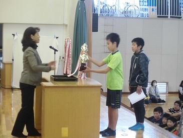 「熊本子どもの美術展」特選作品の表彰と、バスケットボール部・サッカー部の表彰がありました。その後、旧児童会役員から一年間を振り返っての感想と、新児童会役員から就任のあいさつがありました。これからは、新児童会役員が大津小学校を引っ張っていきます。旧児童会役員さん、大津小学校のために頑張ってくれてありがとうございました。一年間お疲れ様でした。